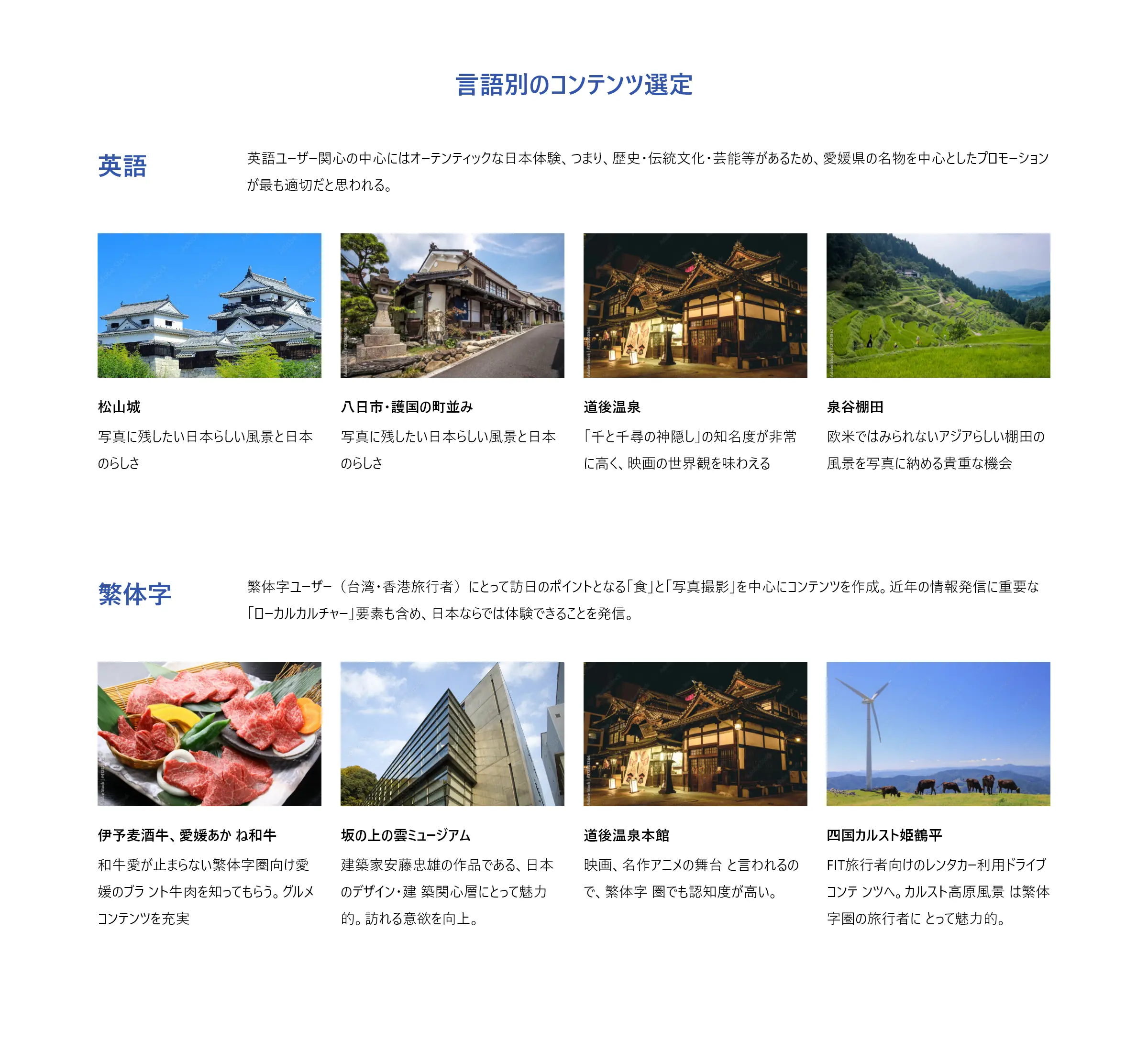 対応範囲は、新規記事作成から、サイト内の新規階層作成、コンセプト案など、様々なニーズ・希望に合わせたコンテンツ案のご提案をすることができます。具体的な事例では、観光サイトに掲載されている「モデルコース」です。外国人に魅力的なスポット・体験を厳選し、ユーザーに刺さるコンテンツ案を提案します。(エクスポートジャパンで可能な多言語コンテンツ制作についてはこちらでご確認いただけます。)