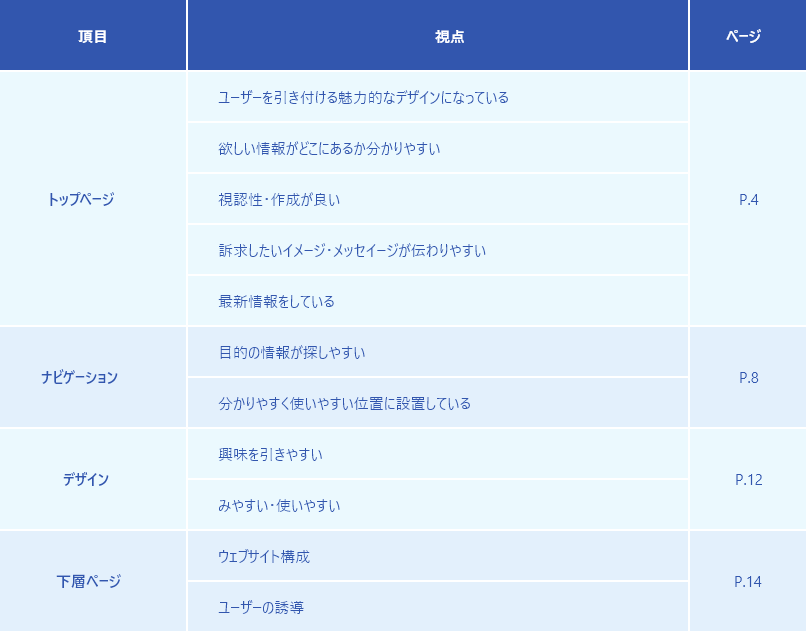 上記の表は、Webサイトレビューをする際のチェック項目の一例です。実際にWebサイトレビューを行う際は、さらにそれぞれの項目をいくつかの視点に分けます。そして、できるだけ具体的な項目で評価を行います。レポートには、評価の基準もレポートで詳しく記載するため、ユーザーの誘導に繋がる改善点とその優先度が明らかになります。